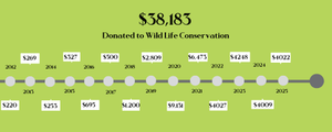 We've donated $21,404 to wild life conservation so far! Our donations over the years have helped save endangered wild animals from extinction. Support our efforts and help grow our donations each year!